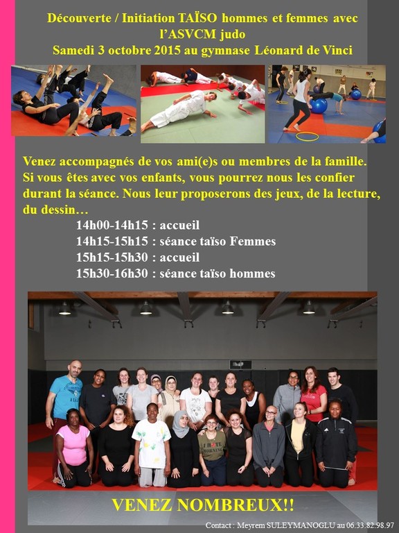 L’ASVCM judo vous propose de découvrir le Taïso, pratique aussi bien destinée aux femmes qu’aux hommes. Le taïso est une discipline associée de la Fédération Française de Judo.