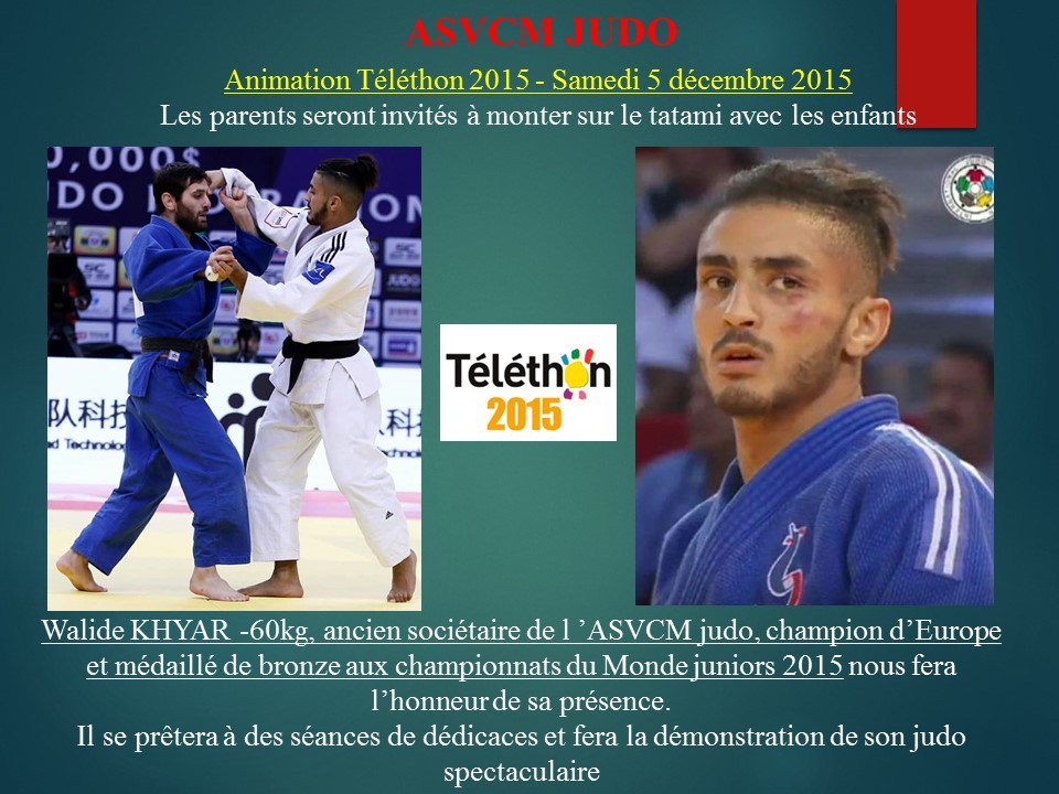 L'ASVCM judo organise une animation dans le cadre du téléthon le samedi 5 décembre 2015. Les séances se dérouleront de 9h00 à 13h00 et à cette occasion, les parents seront invités à monter sur le tapis avec leurs enfants.
