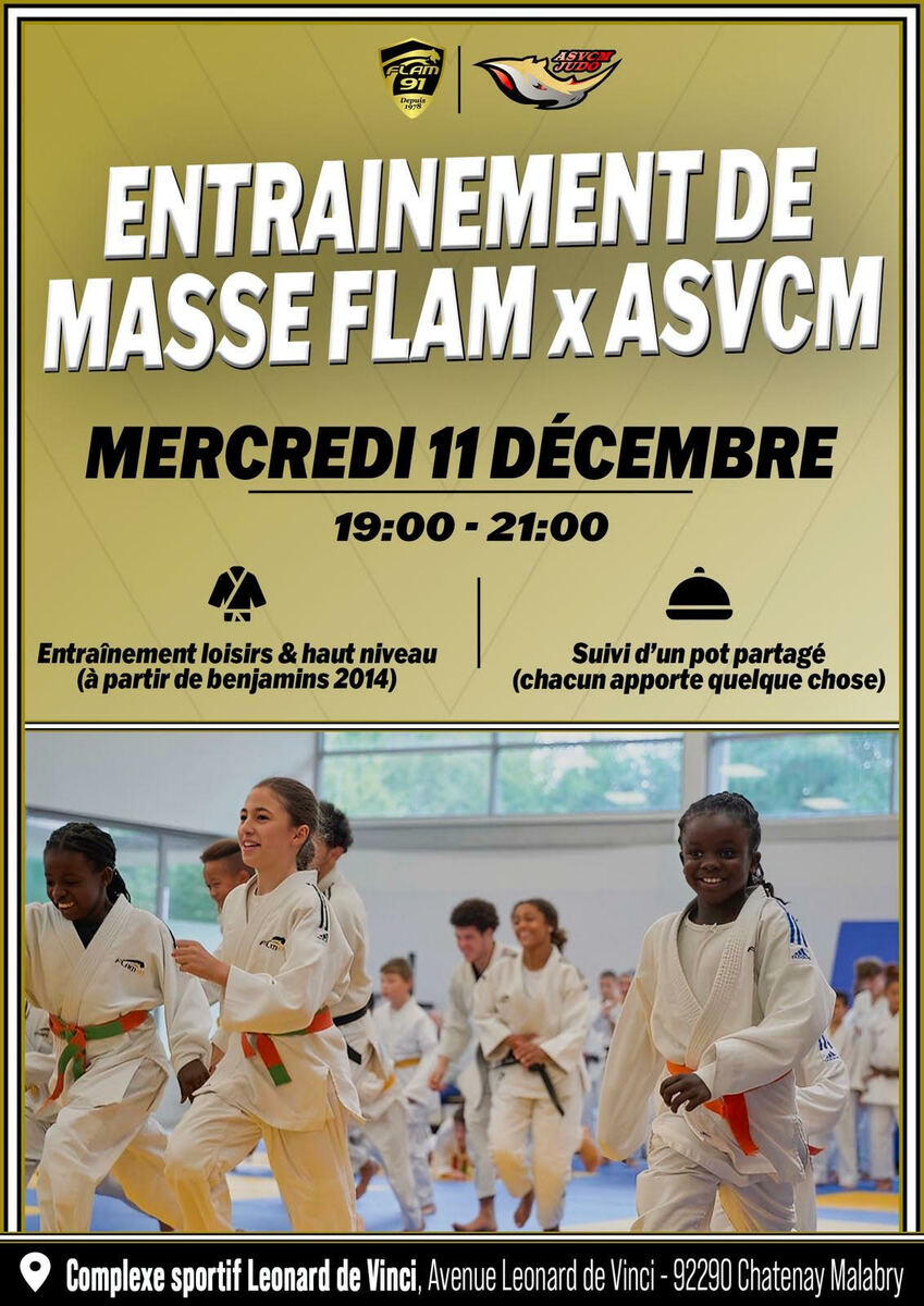 L'ASVCM judo et le Flam 91 co-organisent un entraînement de masse le mercredi 11 décembre 2024, de 19h00 à 21h00, au gymnase Léonard de Vinci.