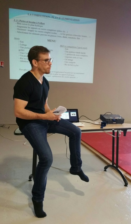 Kilian LE BLOUCH, entraîneur, athlète de haut niveau (il a été sélectionné chez les -66kg aux JO de Rio 2016) a animé cette session. Il a abordé quelques généralités concernant les besoins du judoka sur le plan nutritionnel, a donné des indications sur l'alimentation à privilégier tout au long de la saison sportive dans une perspective de prophylaxie et d'atteinte de performance, a expliqué comment gérer une descente au poids pour aborder la compétition.