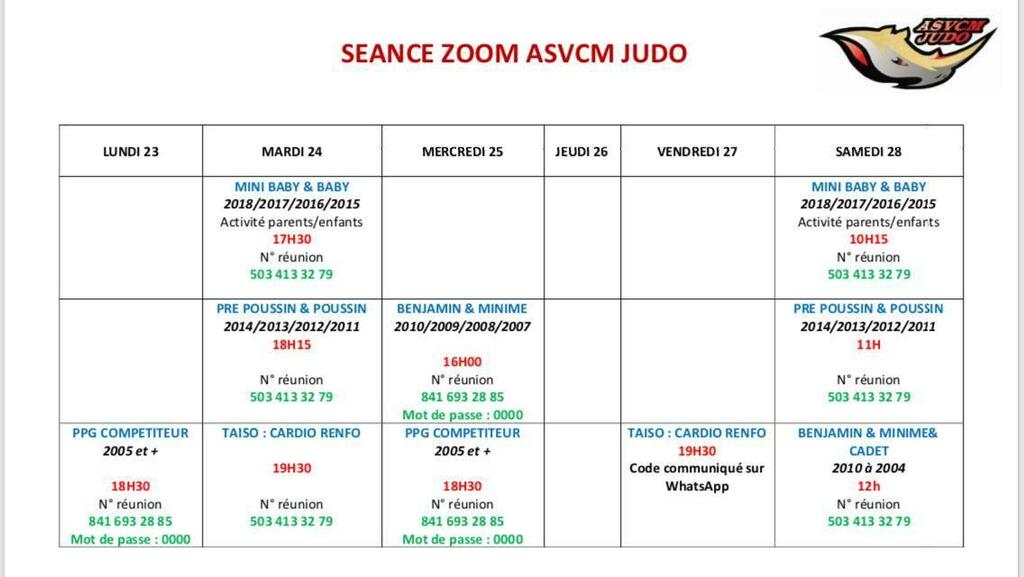 Chers adhérents, voici le programme pour la semaine prochaine.