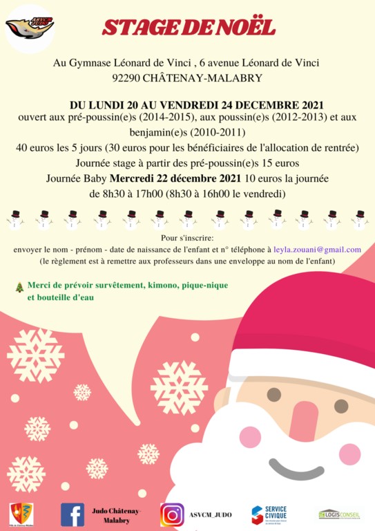 Le stage de Noël se déroulera du lundi 20 au vendredi 24 décembre 2021, de 8h30 à 17h00, sauf le vendredi : 16h00.