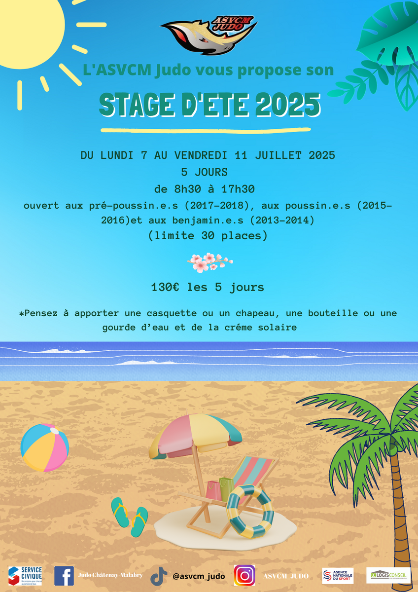 L’ASVCM Judo a le plaisir de vous annoncer l’organisation de son stage d’été 2025, qui se déroulera du lundi 7 au vendredi 11 juillet 2025, de 8h30 à 17h30.